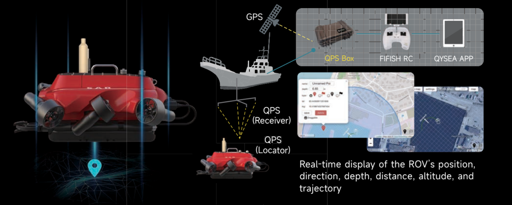 U-QPS es un ecosistema de software y hardware que proporciona un mapa 3D de la ubicación en tiempo real del ROV FIFISH, registros de POI, trayectorias de inmersión tridimensionales, así como una función de un solo clic para volver a su ubicación original. Las aplicaciones de software diseñadas por QYSEA proporcionan al piloto del ROV una experiencia mejorada de funcionamiento e inspección.
