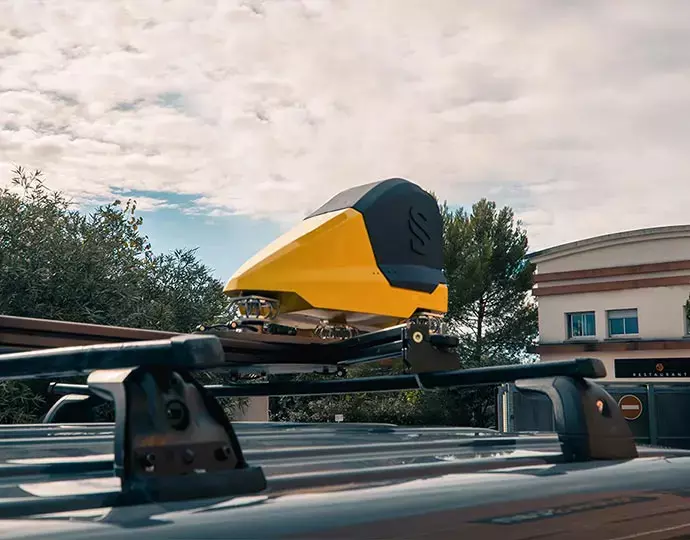 La cápsula para coches Fly & Drive puede montarse en la mayoría de los vehículos terrestres. El soporte especialmente diseñado permite un cambio rápido y sin problemas de la cápsula del coche a cualquier UAV. Gracias a las configuraciones predefinidas, pase del UAV a la cartografía móvil en 2 clics.