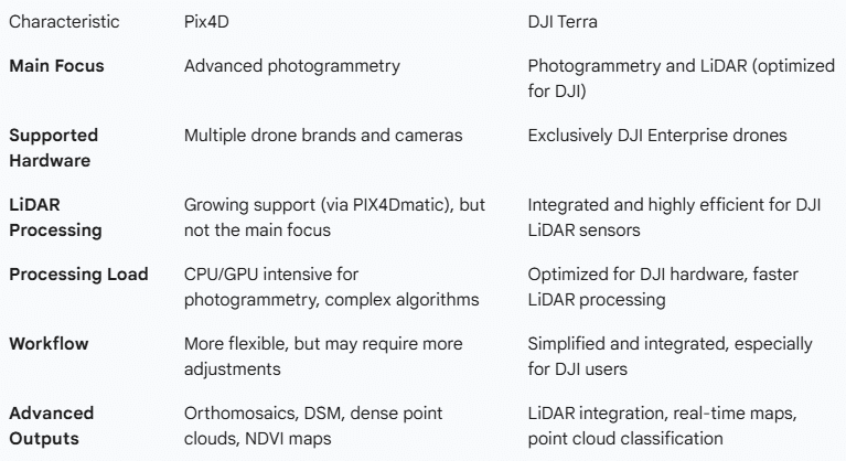 • LiDAR Processing Load: DJI Terra excels at processing LiDAR data. Thanks to its optimization for DJI LiDAR sensors, it can process large volumes of data very efficiently. For example, DJI Terra has been shown to process over 700 GB of LiDAR data in a single day to create dense digital terrain and elevation models. LiDAR processing is inherently less demanding in terms of pixel matching than photogrammetry, focusing on the accurate georeferencing of laser points.