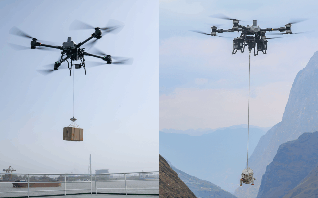 The FlyCart 100 significantly improves the winch system, now called the “Flagship Winch System.” It features a longer 30-meter cable and a 50% faster retraction speed of 1.2 m/s. The system also includes an electric hook for more efficient loading and unloading and maintains the intelligent anti-sway feature to stabilize the load during flight. These improvements make winch deliveries faster and more versatile, especially in steep terrain or over water.