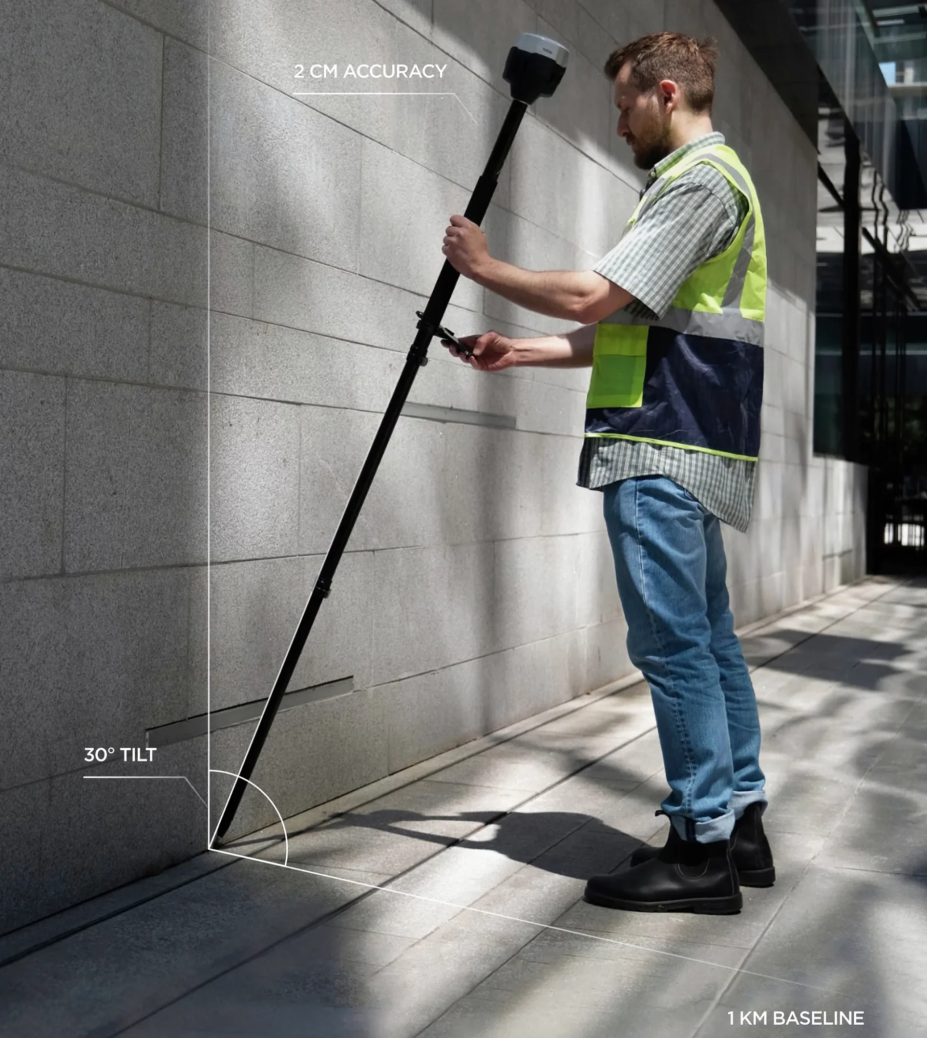 The IMU-based tilt compensation in Reach RS3 allows you to perform measurements with up to 60 degrees of tilt while maintaining an accuracy of 20 mm.