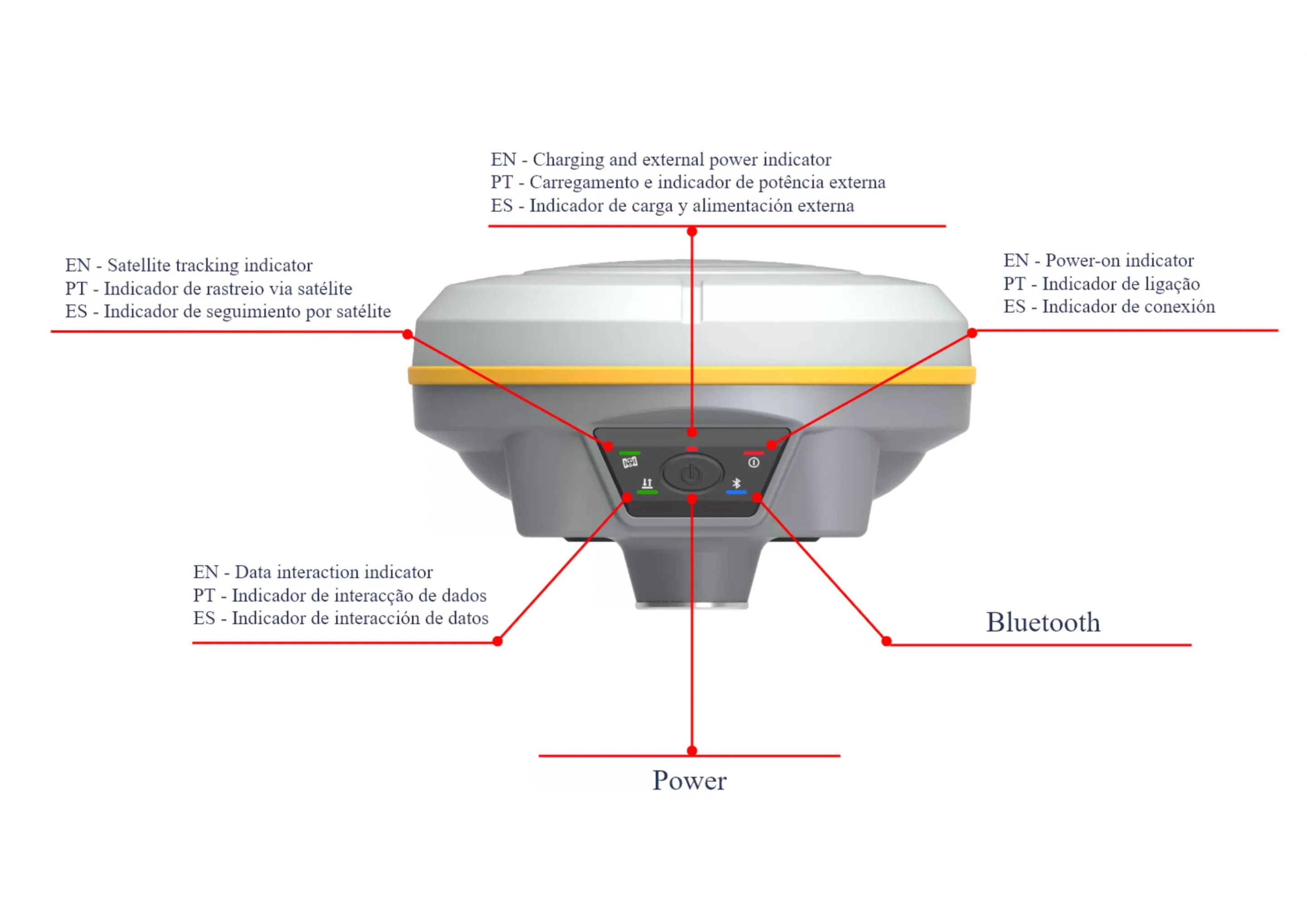 | Indicators | 5 LED indicators (Satellite, Charging, Power, Datalink, Bluetooth) | |