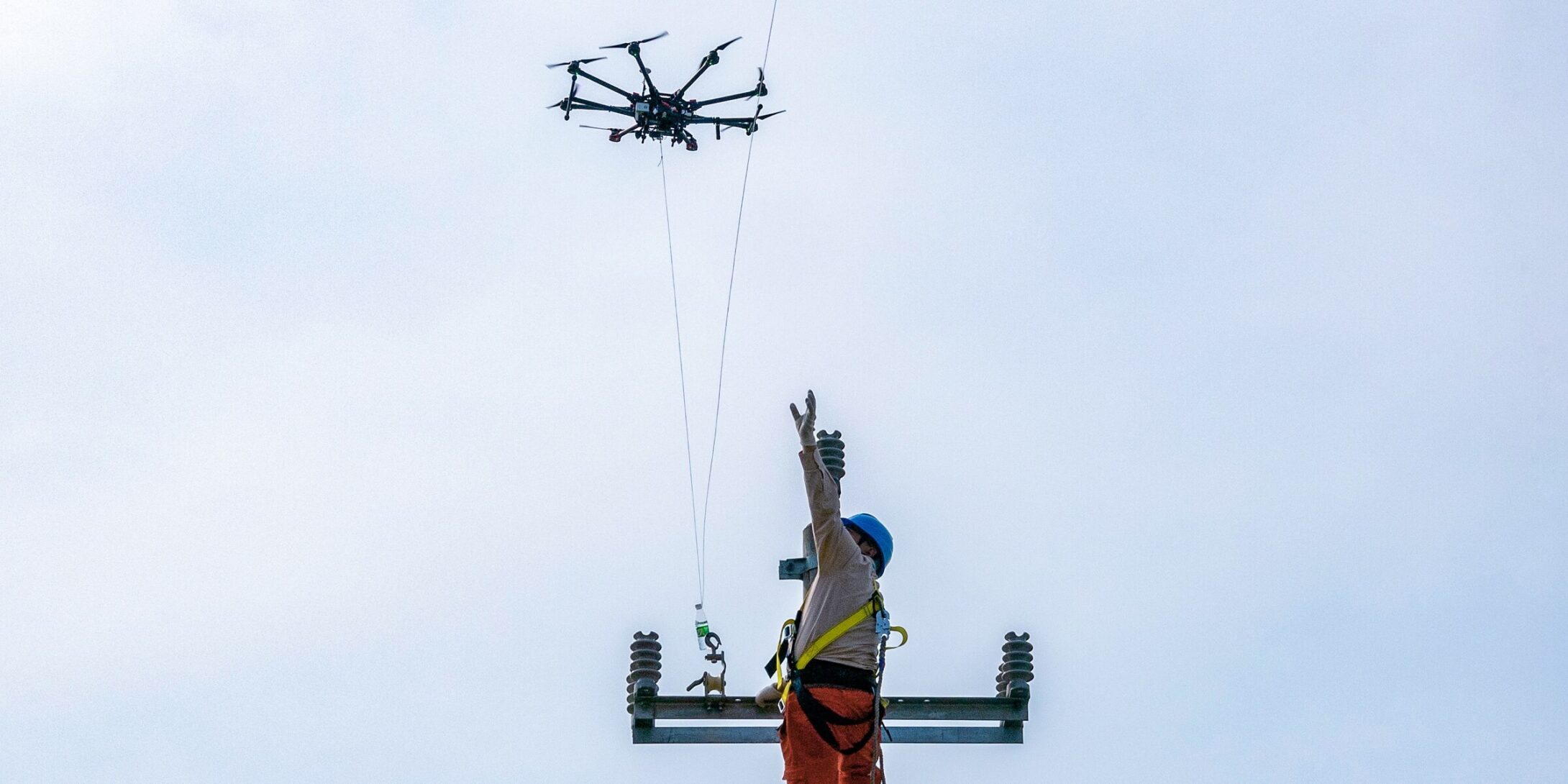 Drones can carry and tie down power lines in mountain ranges and rivers, and are able to take off and land in flexible locations and operate at high altitude.